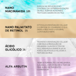 Água, ácido glicólico, óleo da semente de jojoba, ácido tranexâmico, glicerol, palmitato de isopropila, dióxido de silício, isopropanolamina, polietilenoglicol-12 dimeticona, óleo de girassol, fenoxietanol, alfa-arbutina, hietelose, polipropilenoglicol-5-polietilenoglicol-20 éter de álcool cetílico, ácido poliacrílico, sesquicaprilato de xilitila, colesterol, goma xantana, monoestearato de glicerila, lecitina, hidróxido de sódio, caprililglicol, benzotriazilil dodecil p-cresol, edetato dissódico, decilenoglicol, cera de euphorbia cerifera, polissorbato 80, poloxaleno, nicotinamida, adipato de dibutila, tetra-di-t-butil hidróxi-hidrocinamato de pentaeritritila, policaprolactona, palmitato de retinol, tocoferol.